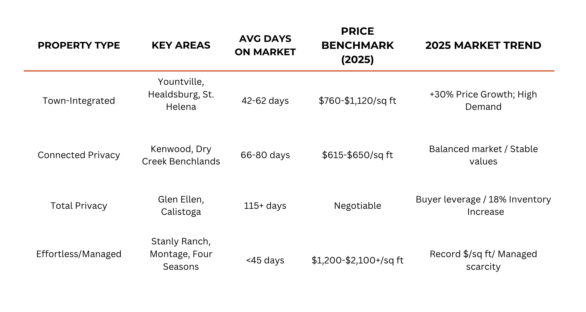 Wine Country's 2025 market revealed meaningful differences in how each segment performed. Town-integrated properties faced competitive demand and constrained inventory. Privacy-focused estates offered negotiating leverage for patient buyers. Turnkey communities commanded premium pricing for buyers prioritizing convenience.